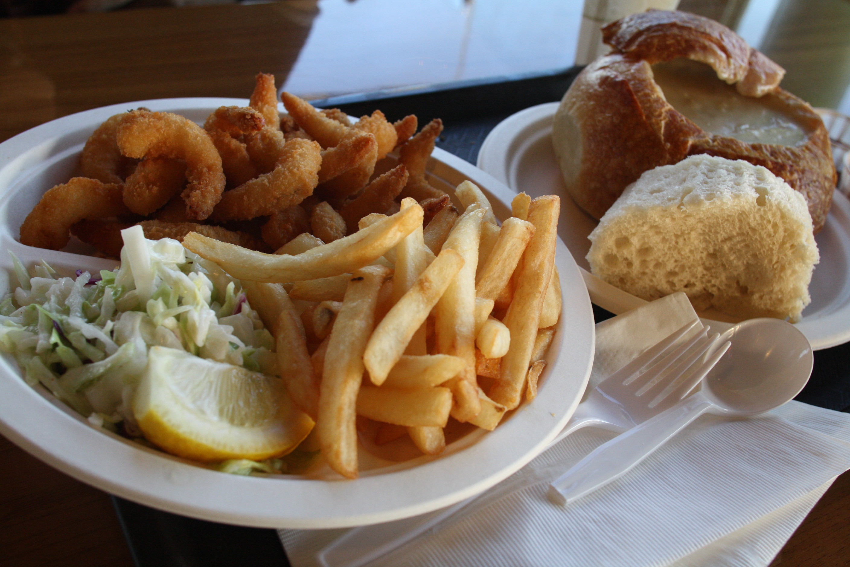 Kの初めてのアメリカご飯は、カニアンドチップス、クラムチャウダーでした。(蟹写ってないけどw)